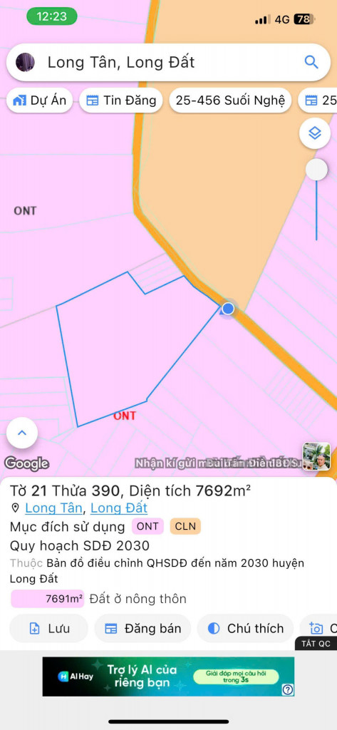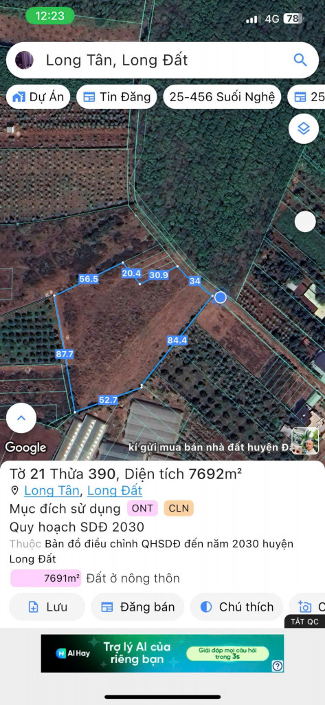 Quý vị đang xem nội dung tin rao "BÁN 7691.5 M² ĐẤT XÃ LONG TÂN, ĐẤT ĐỎ GIÁ 3 TỶ / SÀO. LH:0938677702." -