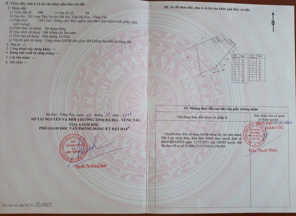 - Diện tích: 7691.5 m² ngang 34 dài 140m, nở hậu. Đất phủ hồng có 100m2 thổ cư.
