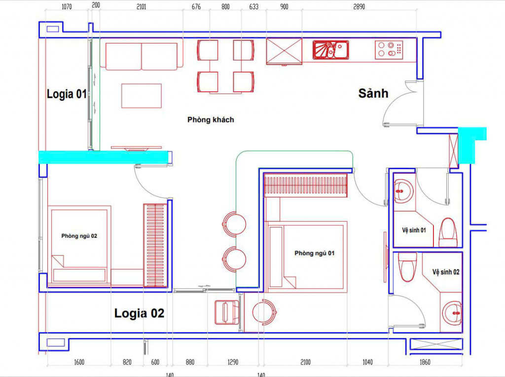 * Căn hộ 2pn 2 logia, có thể thiết kế thành 2n+1 như ảnh