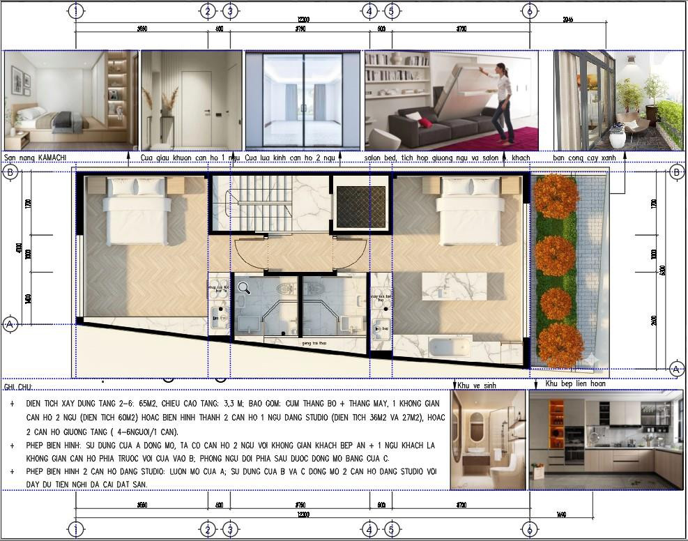 - Bố trí 2 căn hộ khép kín (1 căn studio + 1 căn 2 ngủ), có thể linh hoạt chuyển đổi công năng.
