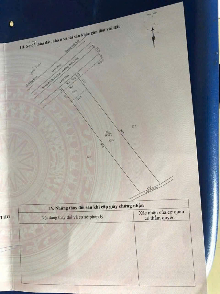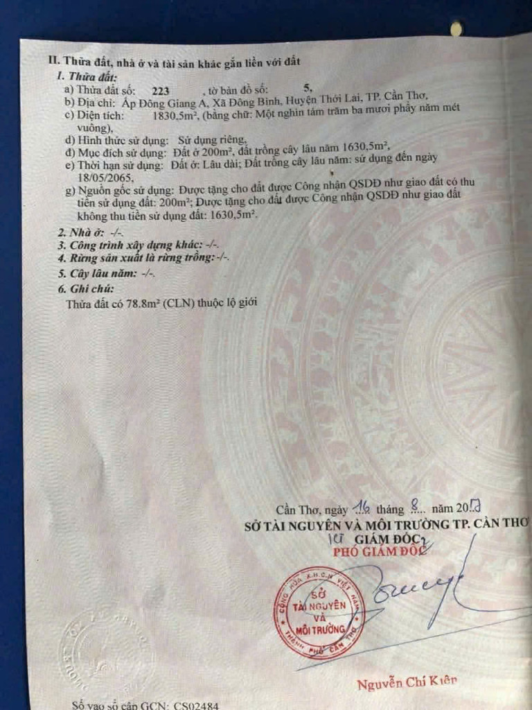 - Tổng diện tích trên giấy 1830m2, (diện tích thực tế sử dụng là 2000 m²)-MT ngang 16,3m2 dày hết đất. Thổ cư 200m2 còn lại CLN. Đã xây hàng rào kiên cố xung quanh