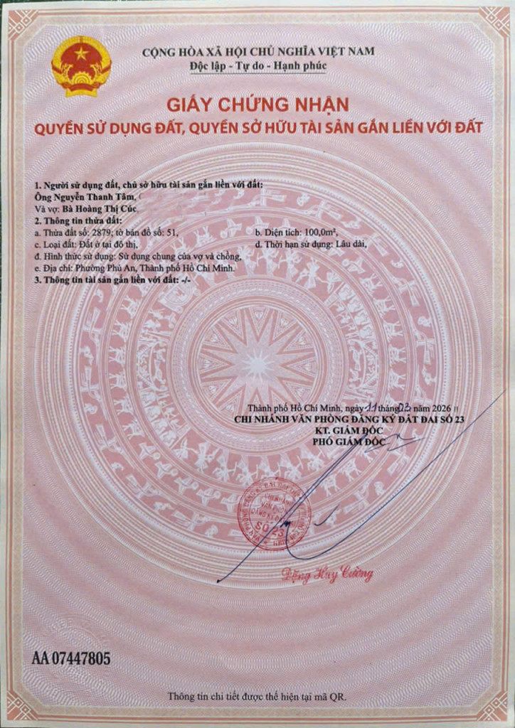+ Diện tích: 100m² (5m x 20m) – Thổ cư 100%