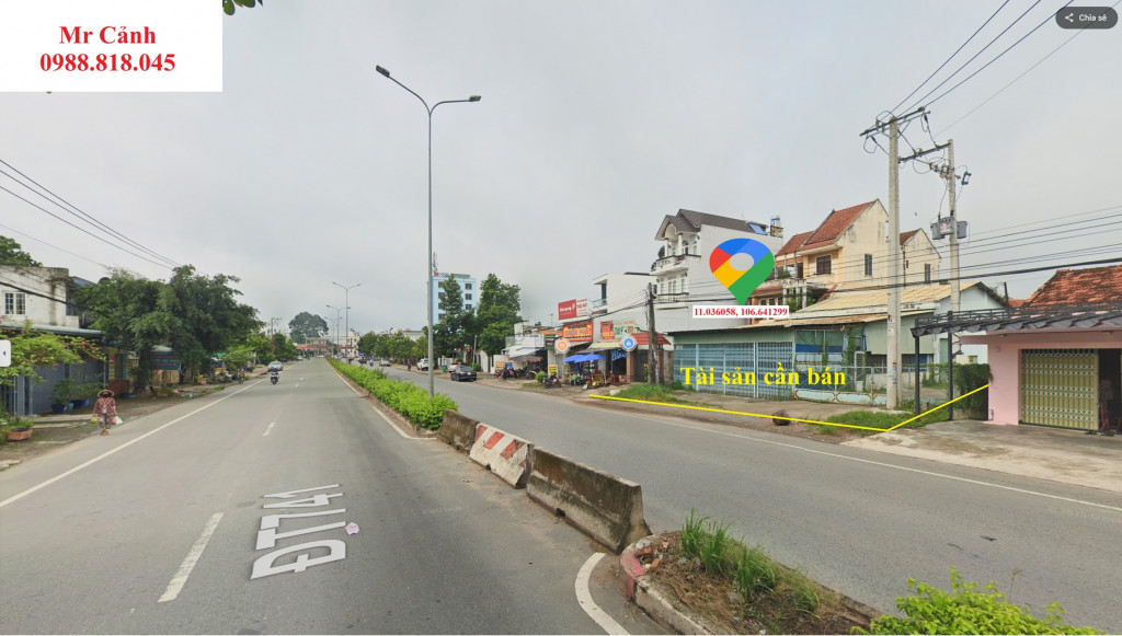 Mặt tiền 15.48m, diện tích 4585.3m2, (300m2 đất ở, 4285.3m2 đất cây lâu năm), nằm mặt quốc lộ 741 giao cắt với địa lô Bình Dương, Đường Mỹ Phước - Tân Vạn