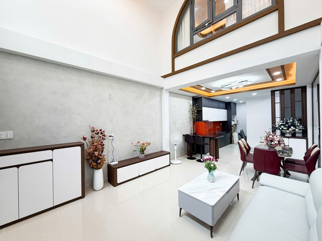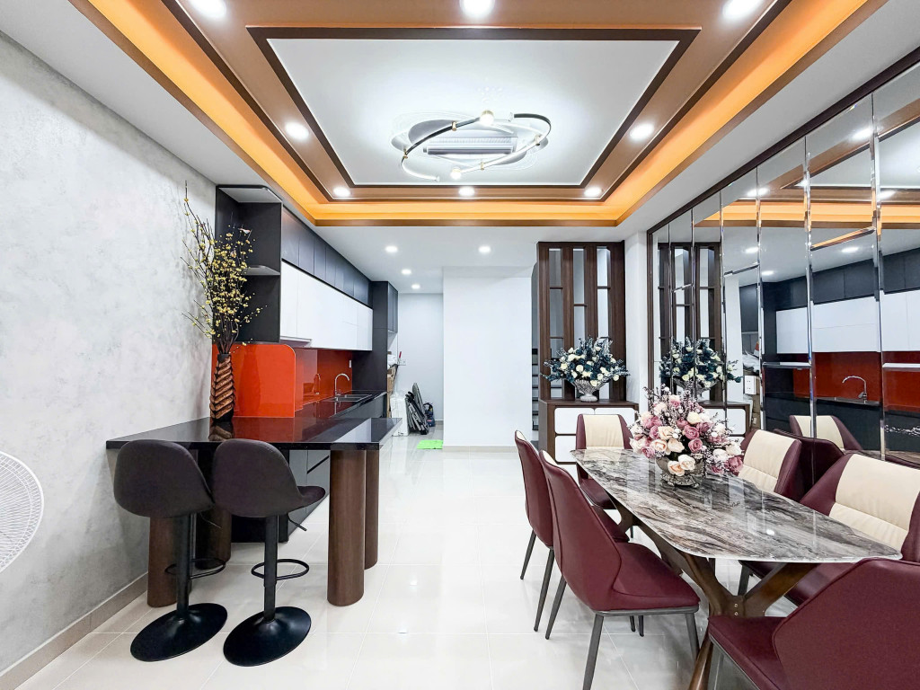 Phòng khách rộng thoáng, trần cao sang trọng, bộ sofa – bàn ăn – bếp – tủ kệ đều được bố trí chỉn chu như căn hộ cao cấp. Không gian sáng sủa, sạch sẽ, ấm cúng – gia đình chỉ cần xách vali vào ở.