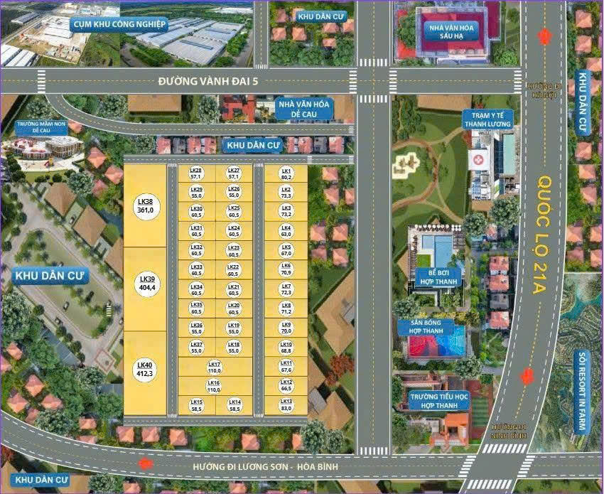 - Hưởng lợi từ các tuyến quy hoạch Vành đai 5 (trọng điểm quốc gia) cách 1.5km – tiềm năng tăng giá