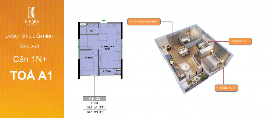 ✅ 1PN+ linh hoạt, dễ tùy biến công năng (ngủ – làm việc – trẻ em).