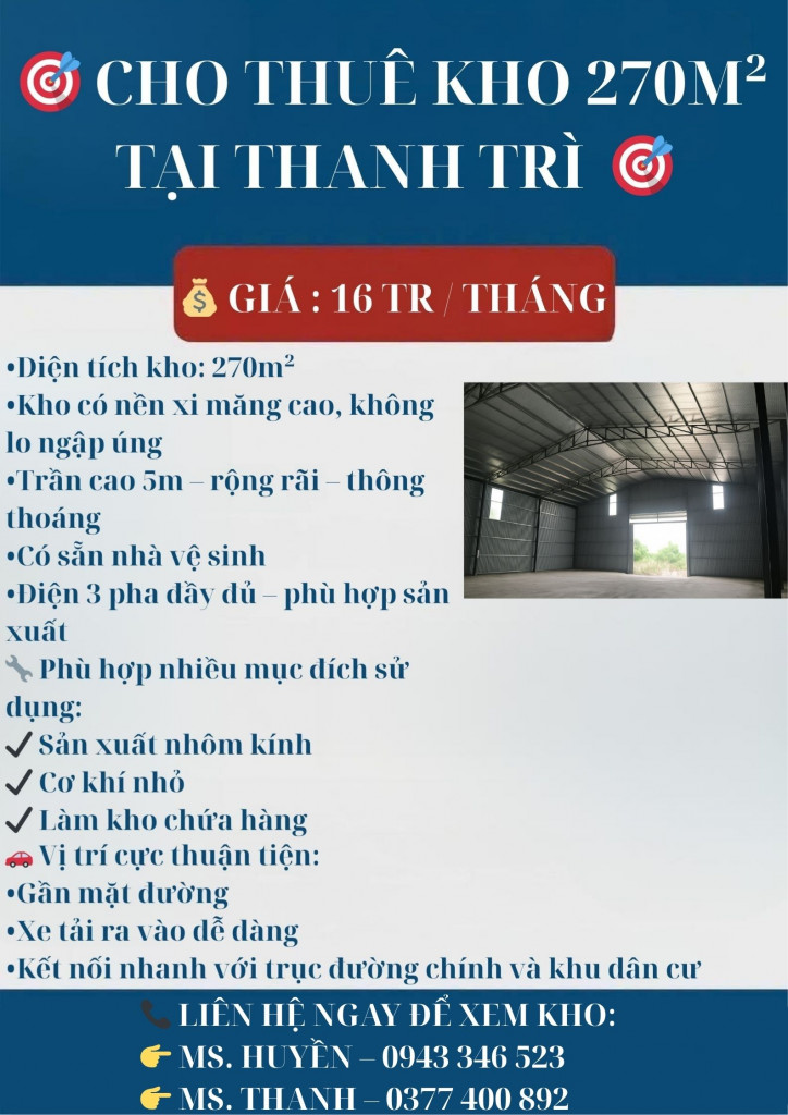 🏭 CHO THUÊ KHO 270M² TẠI THANH TRÌ