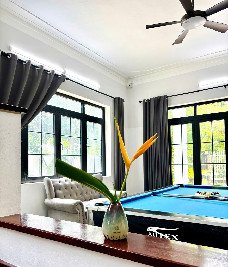 - Hệ thống villa đã được trang bị đầy đủ, gồm có 2 phòng ngủ, 1 phòng khách, phòng ăn, phòng tập gym, bể bơi và sân vườn, 2 bungalow, mỗi bung có 2 tầng, 2 giường