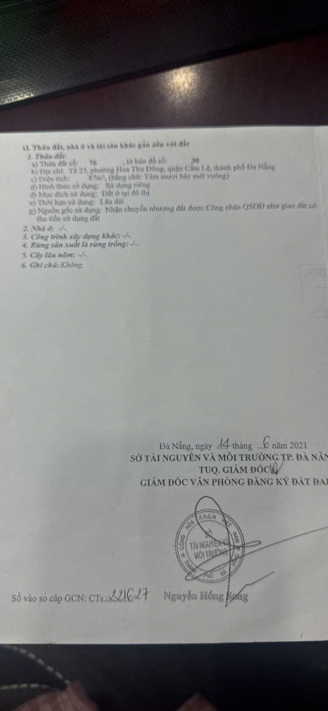 Quý vị đang xem nội dung tin rao "Cơ hội vàng: Đất thổ cư 87m2 Hòa Thọ Đông, Cẩm Lệ, Đà Nẵng, 523/41 Cách Mạng Tháng 8, sổ đỏ, giá 3.8 tỷ." -