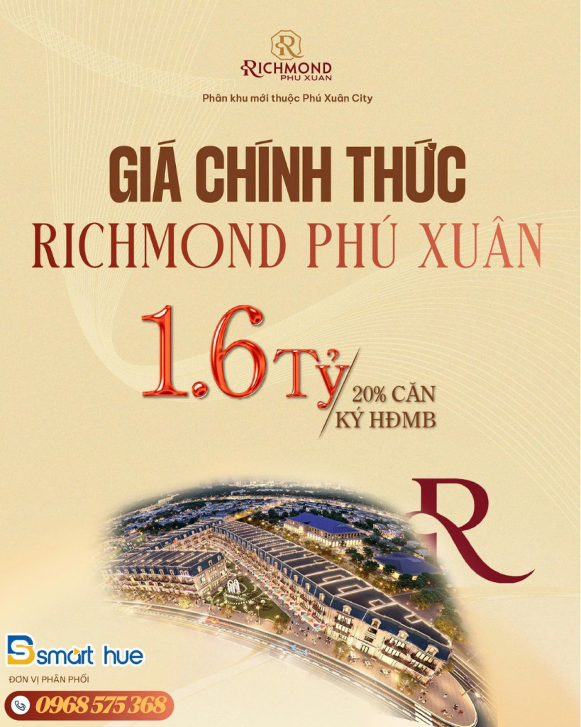 🎯 Chỉ 1,6 tỷ/(20% căn) sở hữu ngay Shophouse Richmond Phú Xuân - Phân khu đối diện Chợ Cống Mới.