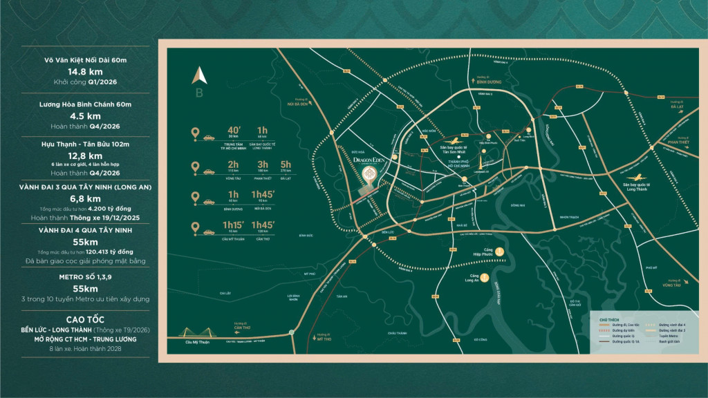Dragon Eden Bến Lức là khu dân cư được quy hoạch đồng bộ, tọa lạc tại vị trí chiến lược hiếm có của khu Tây TP.HCM. Dự án nằm ngay giao điểm các trục giao thông lớn, tạo lợi thế vượt trội cho cả nhu cầu an cư lẫn đầu tư khai thác dòng tiền lâu dài.