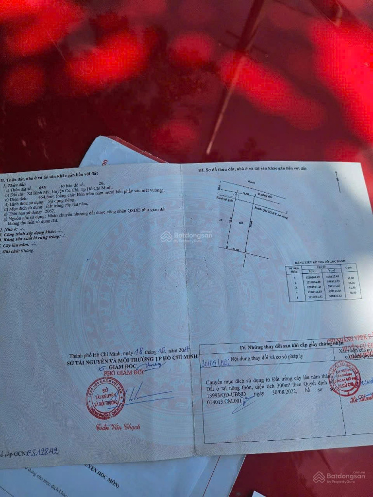 - Diện tích: 454,6 m², có 300 m² thổ cư xây dựng tự do. Mặt tiền rộng 11,8 m đất vuông vức, hiếm