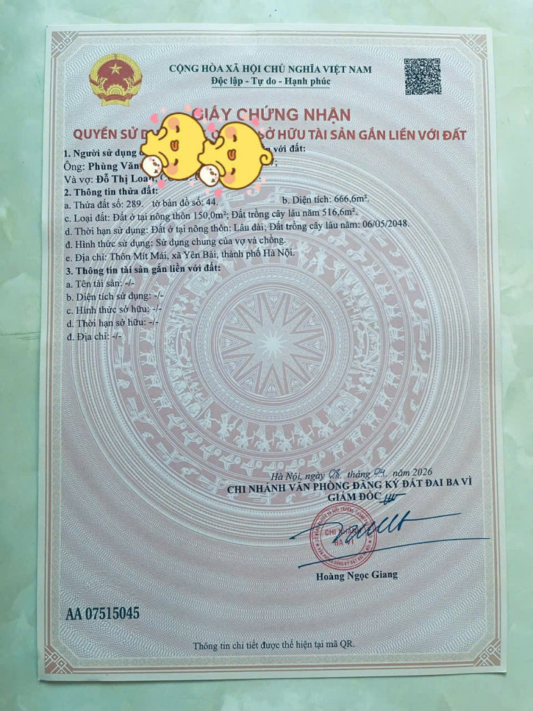 - Diện tích 666,6m2, có 150m2 đất ở, còn lại là đất cây lâu năm
