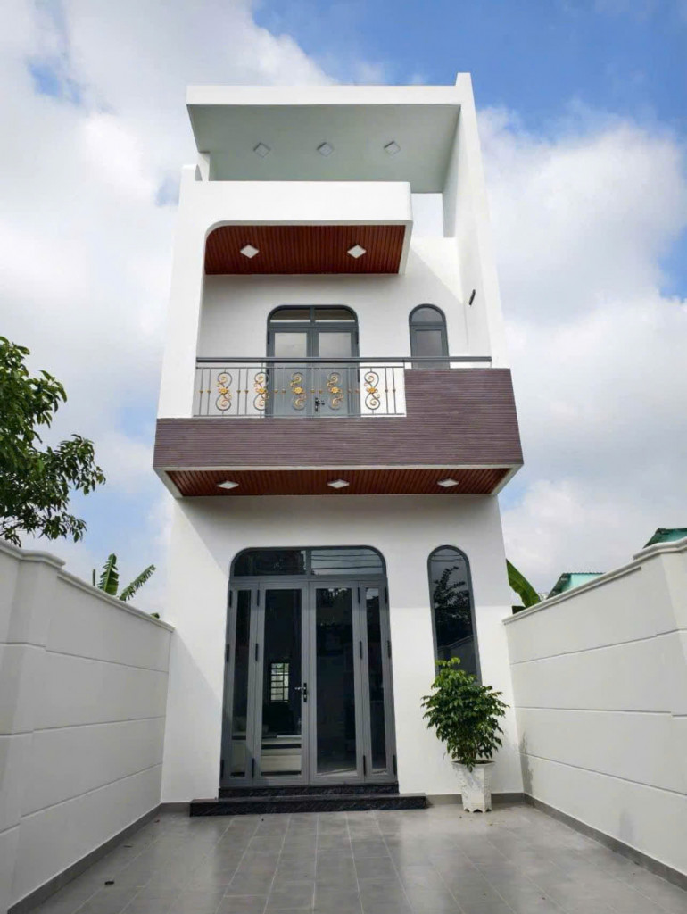 Diện tích 100m² (ngang 5m), kết cấu 1 trệt 1 lầu gồm 2 phòng ngủ, 3 nhà vệ sinh, phòng khách, phòng thờ, giếng trời và sân đậu ô tô rộng rãi.