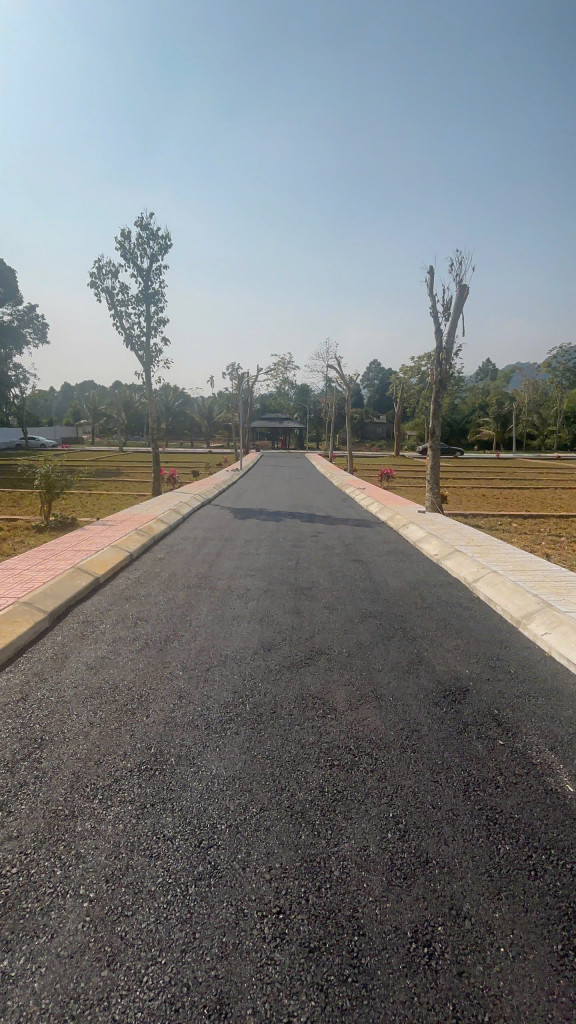 Hình ảnh thực tế cho thấy một khu đất đã hoàn thiện hạ tầng, đường nội khu trải nhựa rộng rãi, vỉa hè lát đá, cây xanh trồng đồng bộ – đúng chuẩn một khu ở kết hợp nghỉ dưỡng.