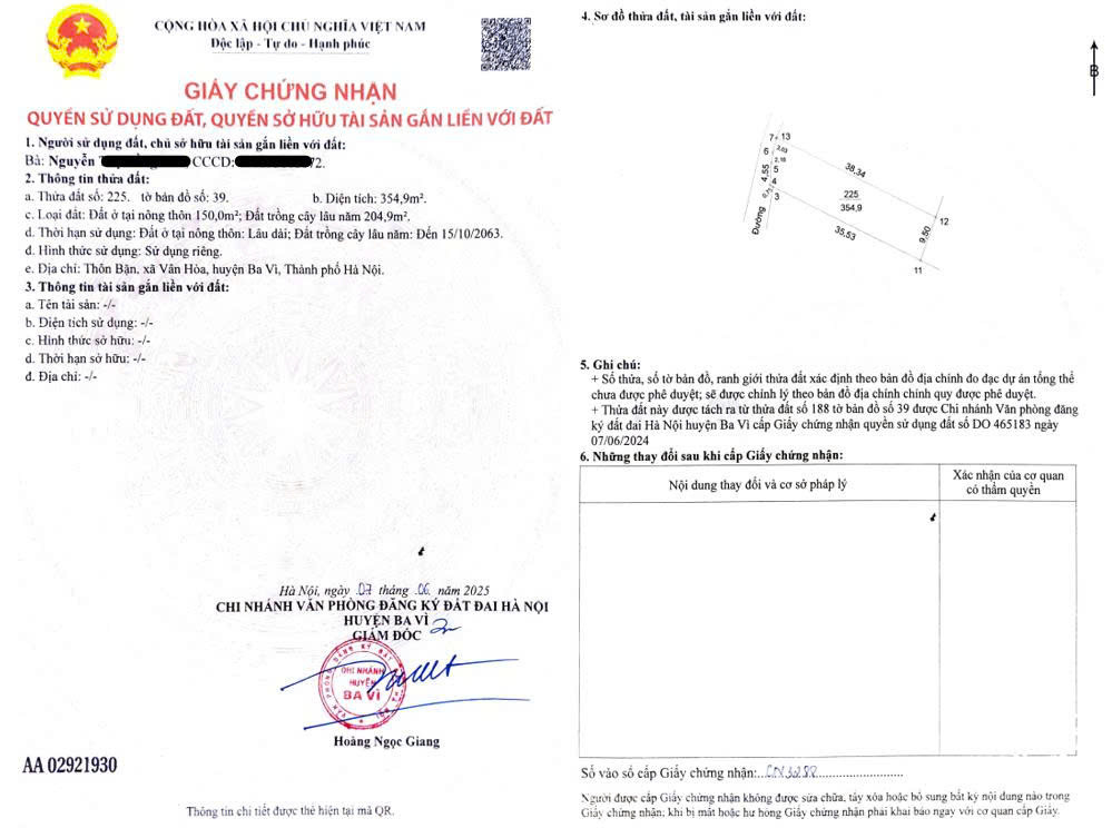 - Diện tích 354,9m2, có 150m2 thổ cư, còn lại là đất cây lâu năm