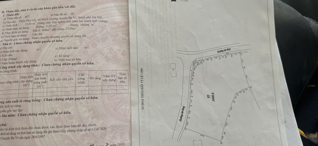 - Diện tích 2120m2, có 400m2 đất ở. Tổng diện tích thực tế 2495m2