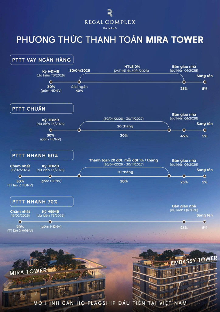 Regal Complex mô hình CĂN HỘ FLAGSHIP kết hợp TRUNG TÂM THƯƠNG MẠI, NGHỆ THUẬT KIẾN TRÚC và chuẩn sống WELLNESS LUXURY sẽ CHÍNH THỨC NHÂN BOOKING.Đừng bỏ lỡ CƠ HỘI trở thành một trong những KHÁCH HÀNG ĐẦU TIÊN sở hữu tuyệt tác này với loạt ƯU ĐÃI ĐẶC QUYỀN:- Chiết khấu lên đến 15%- Early Bird 100 triệu đồng- Hỗ trợ lãi suất 0%- Miễn phí quản lý 3 nămTỔNG QUAN DỰ ÁN- Quy mô: 418 căn hộ hạng sang- Hình thức sở hữu: Sổ hồng lâu dài- Số tầng: 20 tầng- Diện tích đất: 5.638m²- Tổng diện tích sàn: 66.713,2 m²- Mật độ xây dựng: 57,89%- Số thang máy: 10 thang máy- Số tầng hầm: 025 GIÁ TRỊ TẠO NÊN ĐẲNG CẤP CĂN HỘ FLAGSHIP- Vị trí & tầm nhìn đắt giá: Nằm tại trục giao thông trung tâm, sở hữu view sông biển đô thị hiếm có.- Kiến trúc biểu tượng: Thiết kế tinh tế, giàu tính nghệ thuật, chuẩn hóa trải nghiệm sống xa xỉ.- Tiện ích dịch vụ 5 sao: Không gian sống như khách sạn quốc tế với hệ tiện ích cao cấp, chỉn chu từng chi tiết.- Giá trị khai thác vượt trội: Thu hút khách thuê cao cấp, tạo dòng tiền ổn định và tiềm năng tăng trưởng dài hạn.- Tinh hoa phong cách sống: Hệ sinh thái sống cân bằng, riêng tư, đề cao sức khỏe và gu hưởng thụ của chủ nhân4 ĐIỂM CHẠM ĐẮT GIÁ KHI ĐẦU TƯ VÀO REGAL COMPLEX- Chạm vị trí chiến lược- Chạm hệ sinh thái tiện ích quốc tế- Chạm tiềm năng đầu tư bền vững- Chạm sản phẩm vượt chuẩnTrở thành cư dân của Regal Homes, khách hàng chính thức nắm giữ "Tư cách thành viên" vào một hệ sinh thái độc bản - nơi giá trị được đo đếm bằng từng trải nghiệm sống đỉnh cao, sự bình yên viên mãn và câu chuyện đẳng cấp đang kiến tạo.Liên hệ ngay để được tư vấn nhanh chóng nhất