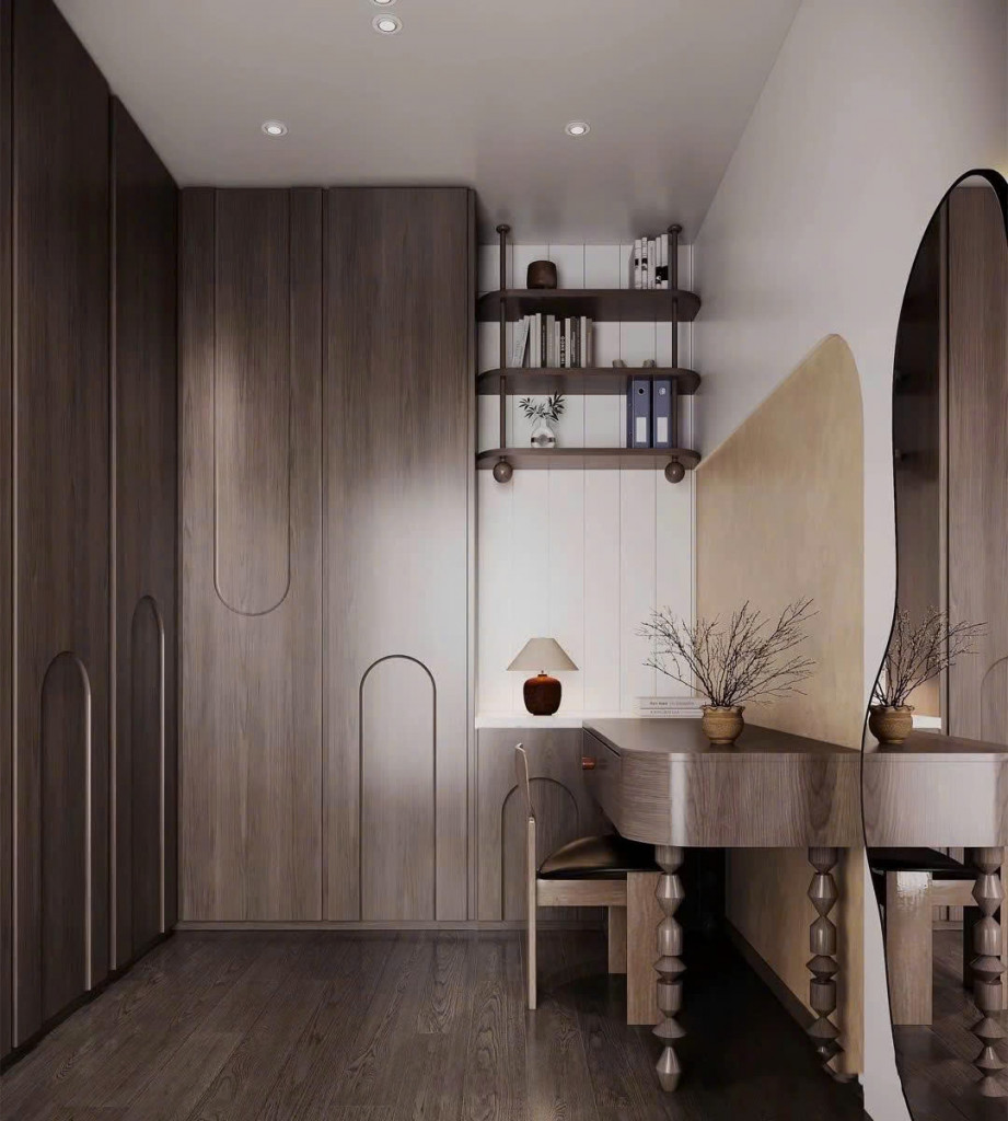 o Khu vực phòng làm việc/trang điểm riêng tư với tủ quần áo âm tường gỗ cao cấp .