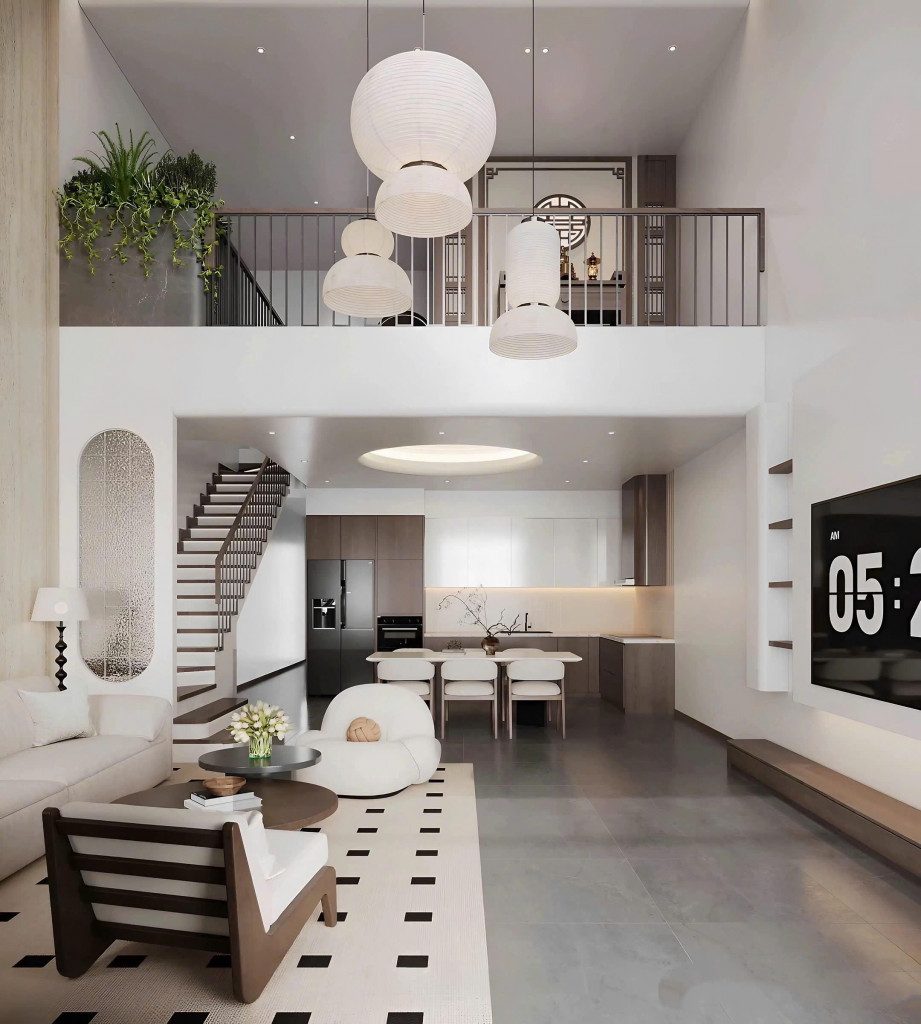 • Không Gian Mở Thoáng Đãng: Khu vực phòng khách và bếp liên thông với giếng trời và ban công trên lầu, tận dụng ánh sáng tự nhiên tối đa, tạo cảm giác rộng rãi và thư giãn.