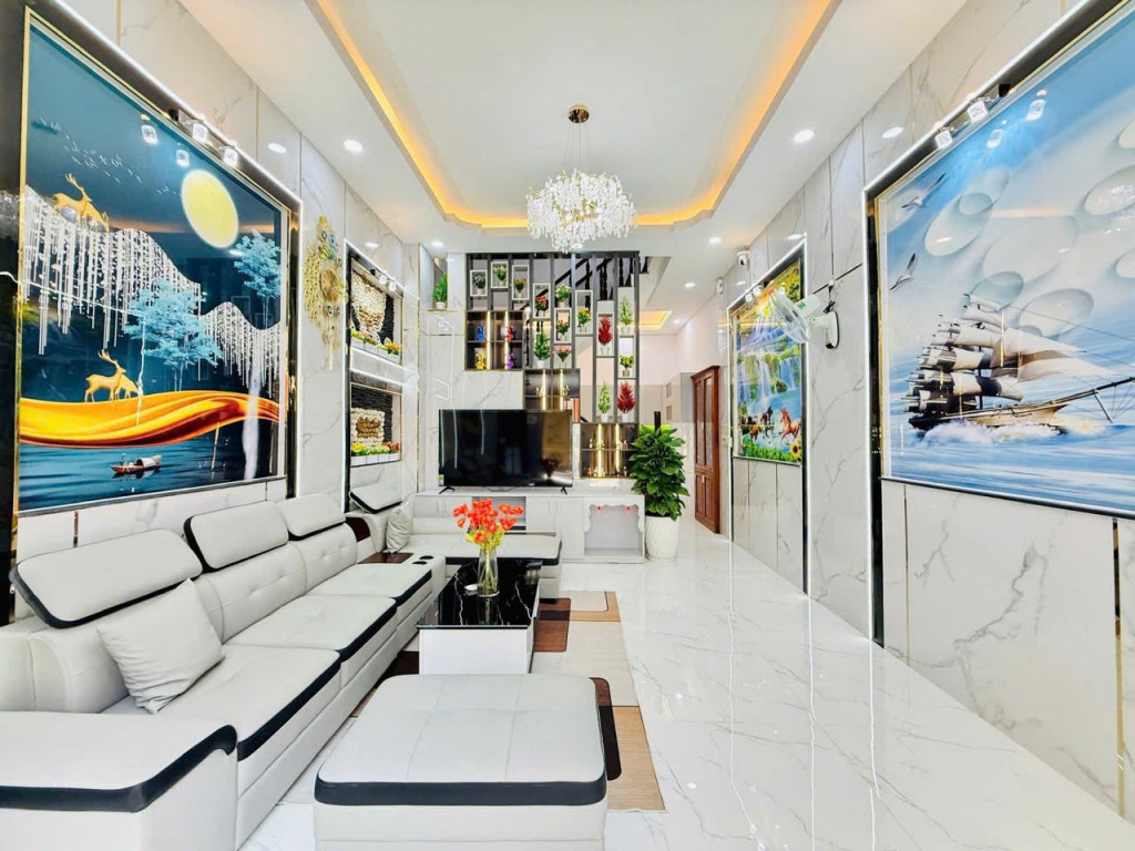 Trệt, 3 lầu BTCT, 4PN, phòng thờ, sân thượng trước sau, sân để xe rộng, 5WC, giếng trời.
