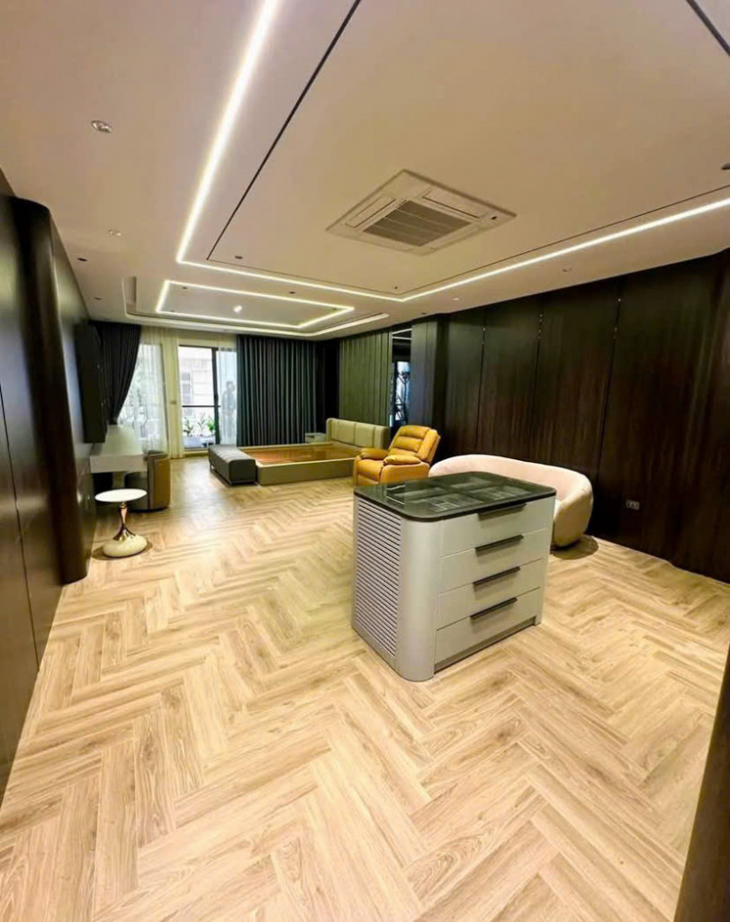 - Nội thất cao cấp: Sàn gỗ sang trọng tại các phòng ở, sàn gạch vân đá tinh tế ở khu vực tầng 1 và các phòng chức năng. Hệ thống đèn chiếu sáng âm trần và đèn hắt trần tạo không gian ấm cúng, hiện đại.