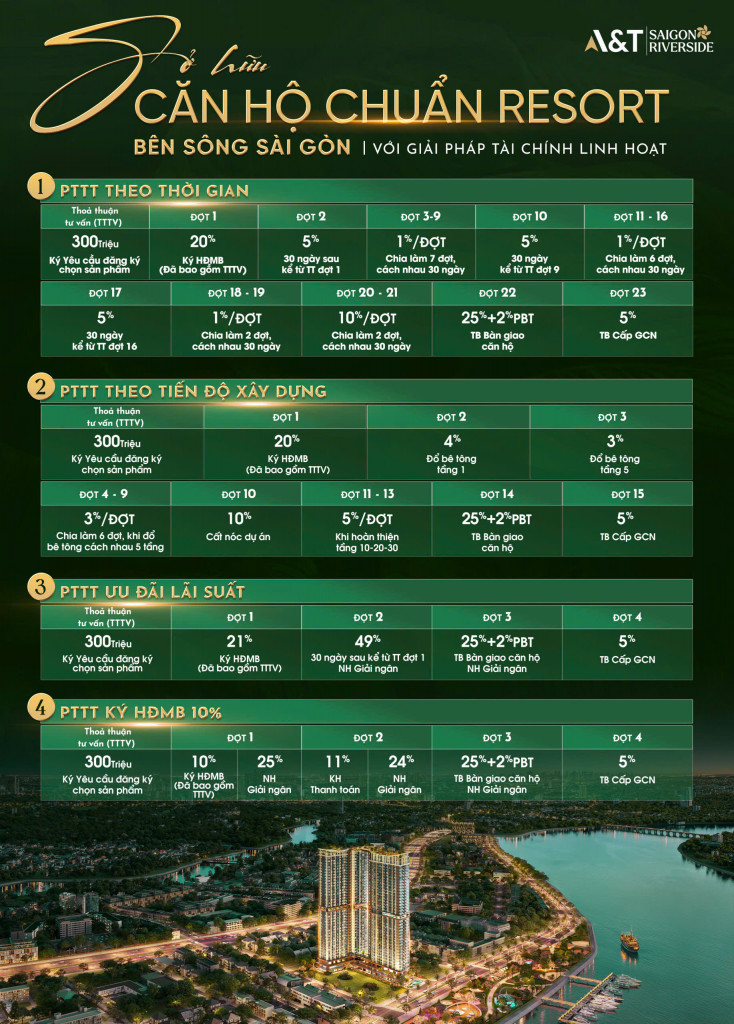 Dự án A&T Saigon Riverside chính thức tung ra chính sách bán hàng đặc biệt dành riêng cho khách hàng giai đoạn đầu. Đây là thời điểm “vàng” để các nhà đầu tư & khách mua ở đón đầu tiềm năng sinh lời vượt trội.