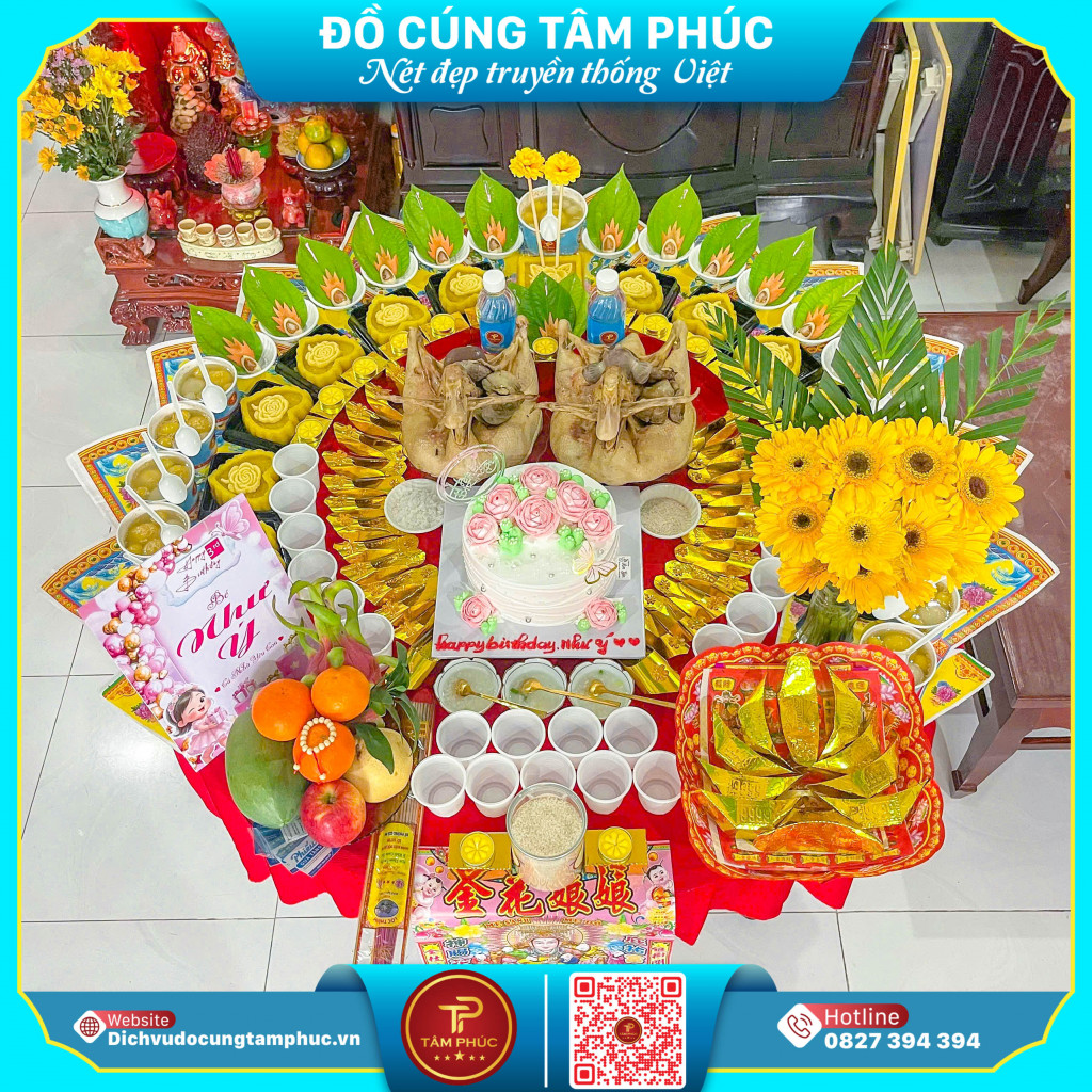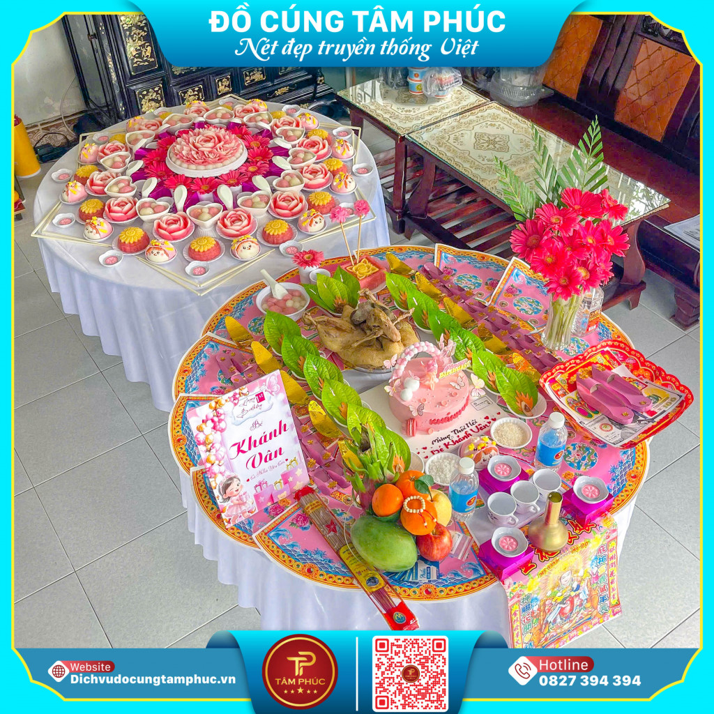 Mâm cúng được bài trí hài hòa, trang trọng, mang đến không gian ấm cúng và đầy ý nghĩa cho ngày đặc biệt của bé.