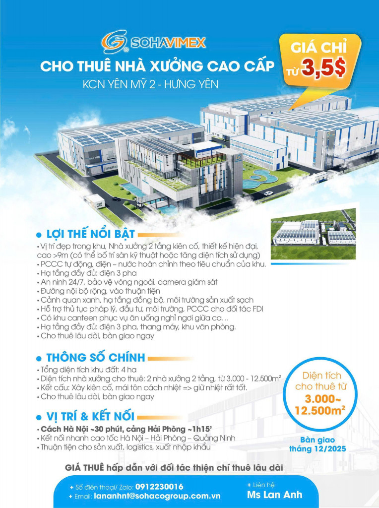 Chính chủ cho thuê nhà xưởng cao cấp từ 3000m đến 12.500m với giá khởi điểm từ 3,5$ tại KCN Yên Mỹ 2 Hưng Yên
