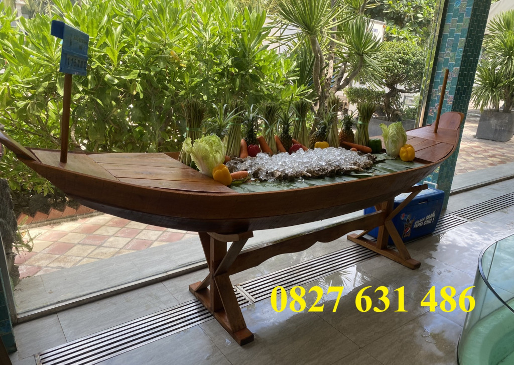 Chuyên thuyền gỗ trưng hải sản, Thuyền decor 3m, Xuồng decor trưng bông