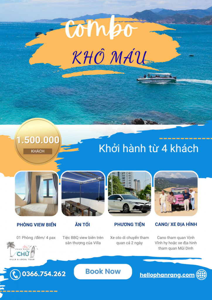 - 𝑪𝒐𝒎𝒃𝒐 𝑲𝒉𝒐̂ 𝒎𝒂́𝒖: 01 phòng Villa view biển (4 khách) + Tiệc BBQ rooftop tại Villa ngắm trọn biển + 01 xe ô tô di chuyển tham quan theo nhu cầu khách + Cano tham quan Vĩnh Hy/ hoặc xe địa hình tham quan Mũi Dinh