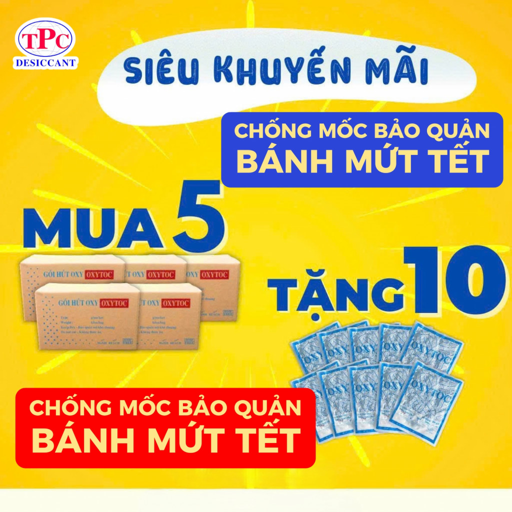 Sau khi đóng gói, oxy còn sót trong bao bì chính là nguyên nhân khiến bánh kẹo, mứt Tết bị mốc, hôi dầu và xuống màu. Gói hút oxy OXYTOC giúp giảm oxy từ bên trong, hỗ trợ chống mốc bánh mứt hiệu quả mà không cần dùng chất bảo quản.