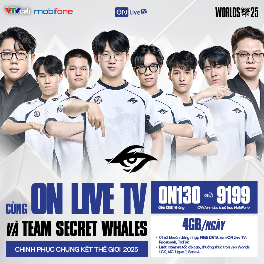 Chỉ với 130.000đ/tháng, soạn ngay cú pháp ON130 gửi 9199 để cùng MobiFone và OnLive TV theo dõi hành trình của Team Secret Whales tại Worlds 2025!