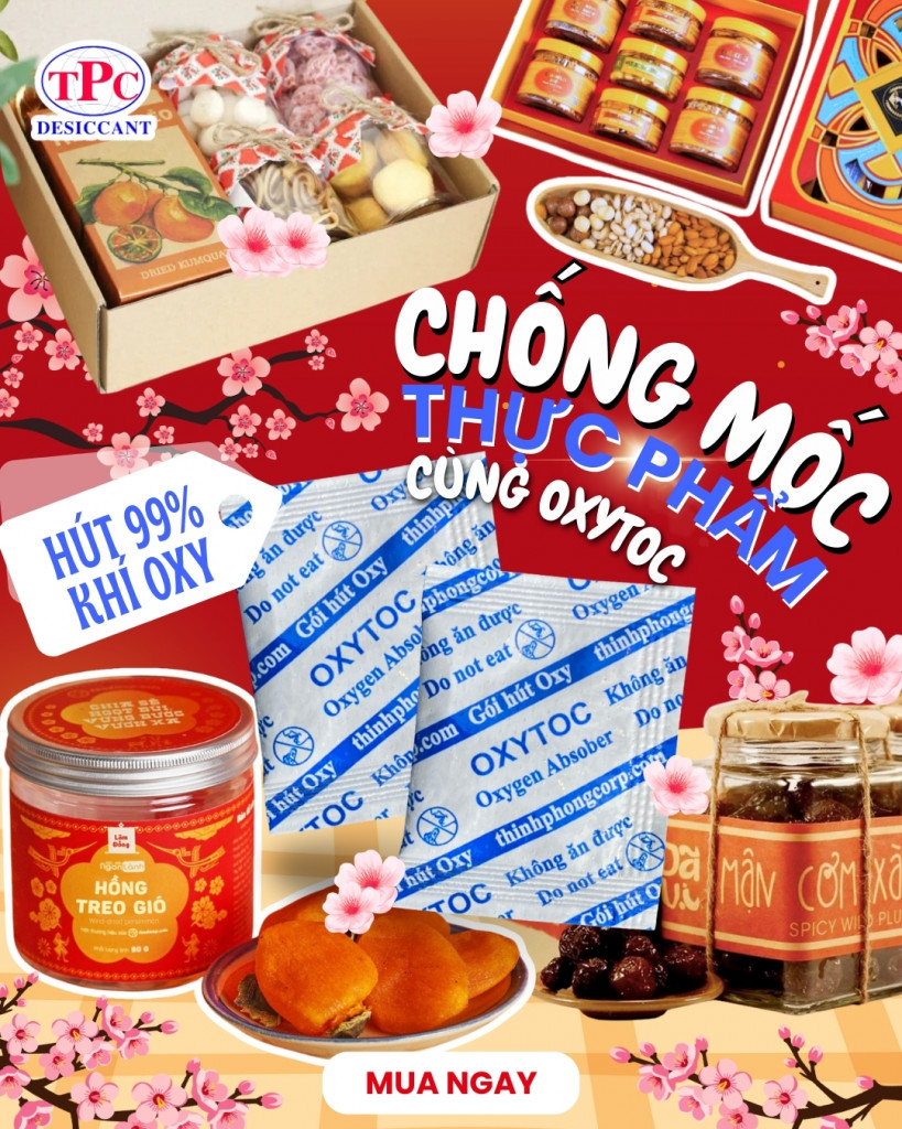 Bao bì kín chưa đủ nếu oxy vẫn còn tồn tại bên trong, đây là nguyên nhân khiến bánh mứt Tết bị mốc, hôi dầu và giảm chất lượng khi lưu kho. Gói hút oxy OXYTOC giúp loại bỏ oxy dư trong bao bì, hỗ trợ chống mốc bánh mứt Tết hiệu quả từ bên trong.