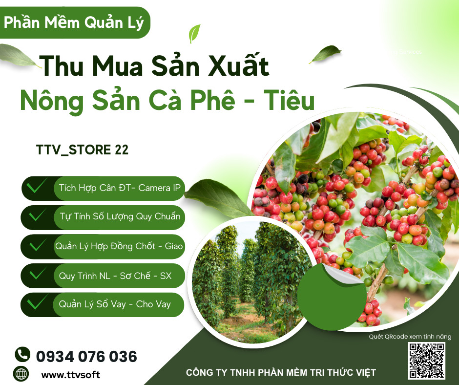 Phần mềm thu mua cà phê – tiêu của Tri Thức Việt được thiết kế chuyên biệt cho doanh nghiệp và đại lý thu mua, giúp quản lý toàn bộ quy trình mua – bán, tính quy chuẩn, kho – sản xuất và kế toán một cách chính xác – minh bạch – hiệu quả