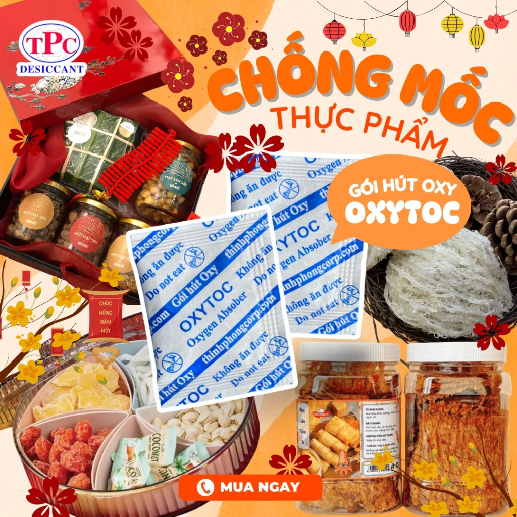 OXYTOC là gói hút oxy, có tác dụng giảm lượng oxy còn tồn trong bao bì - yếu tố chính gây mốc và oxy hóa thực phẩm. Giải pháp này an toàn, không cần dùng chất bảo quản, phù hợp cho bánh kẹo, mứt Tết, thực phẩm khô trong quá trình lưu kho và phân phối.