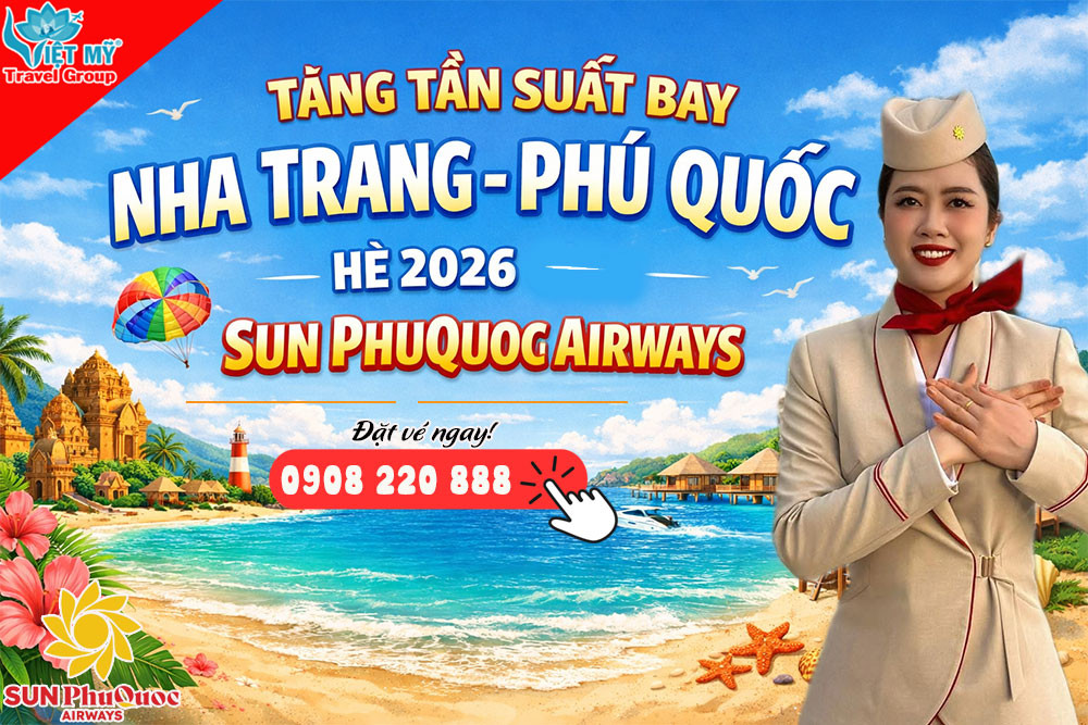 Mùa hè 2026, nhu cầu du lịch biển tăng cao, Sun PhuQuoc Airways chính thức nâng tần suất đường bay Nha Trang – Phú Quốc từ 4 chuyến/tuần lên 1 chuyến/ngày, áp dụng từ 25/05 đến 05/09/2026. Việc tăng chuyến giúp hành khách linh hoạt lựa chọn giờ bay, dễ dàng đặt vé hơn trong giai đoạn cao điểm.