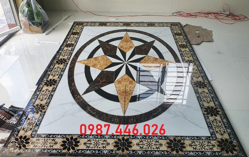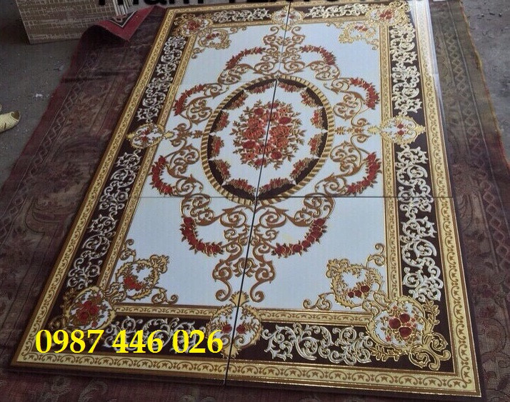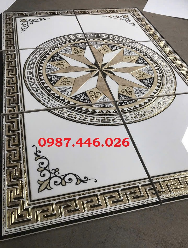 - Chất liệu: Gạch granite mặt men vi tinh khắc vàng