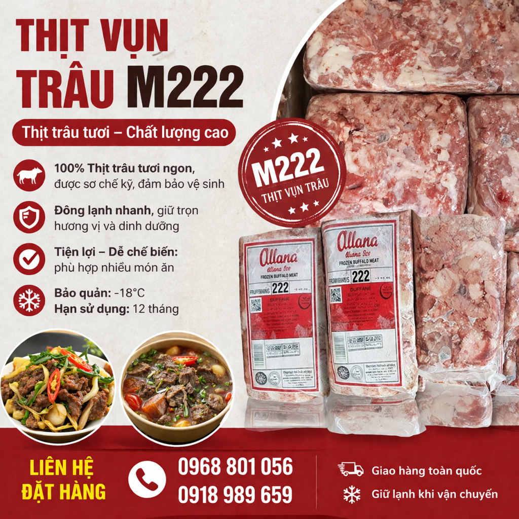 Thịt nạc vụn trâu Ấn Độ (mã 222) được nhập khẩu trực tiếp từ Ấn Độ, bảo quản đông lạnh ở nhiệt độ -22°C nhằm giữ trọn độ tươi ngon và dinh dưỡng. Nhờ giá thành hợp lý và tính linh hoạt, loại thịt này rất được ưa chuộng trong chế biến món ăn gia đình và quán ăn.