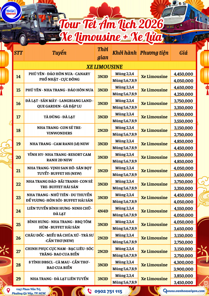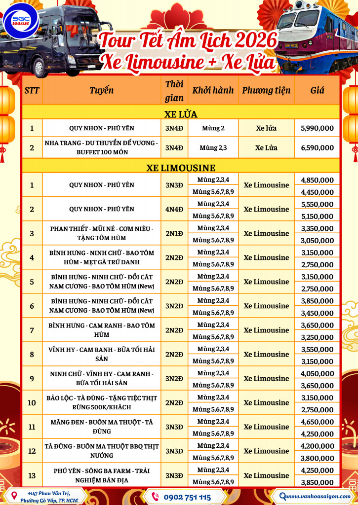 TOUR TẾT 2026 TRÊN XE LIMOUSINE VÀ TÀU LỬA- SGC TOURIST