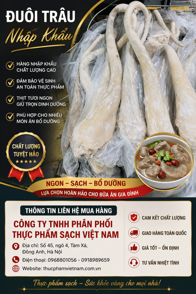 Đuôi trâu là phần cuối của con trâu, có cấu tạo gồm xương, lớp thịt và da bao quanh, tạo nên độ giòn, béo nhẹ và giàu dinh dưỡng. Đây là nguyên liệu được ưa chuộng trong nhiều món ăn bổ dưỡng và đậm vị.