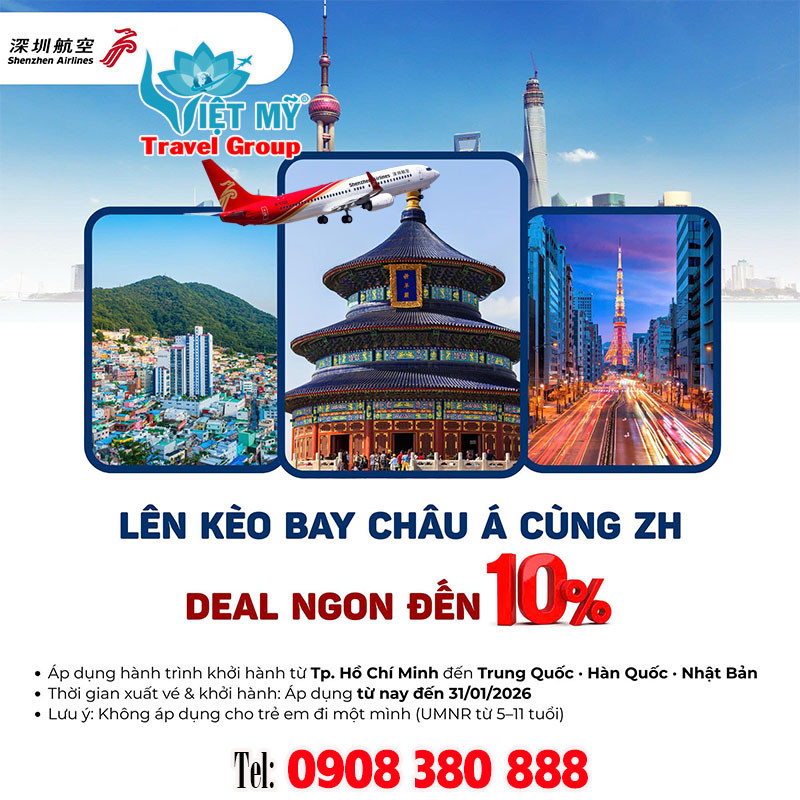 Ưu đãi vé bay châu Á cùng Shenzhen Airlines từ TP.HCM mang đến cơ hội tiết kiệm chi phí cho hành khách có kế hoạch bay đến Trung Quốc, Nhật Bản và Hàn Quốc. Chương trình áp dụng mức giảm lên đến 10% giá vé, phù hợp cho cả hành trình công tác lẫn du lịch trong giai đoạn đầu năm 2026.