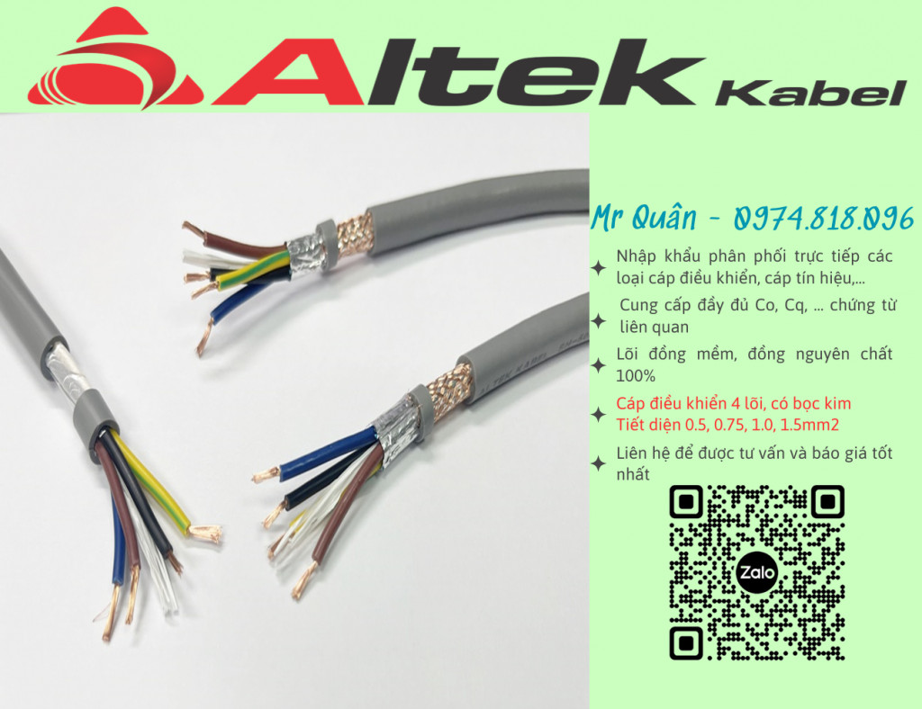Cáp điều khiển 4x0.75 Altek Kabel là dòng cáp tín hiệu được sử dụng phổ biến trong các hệ thống điều khiển công nghiệp, tủ điện và hệ thống tự động hóa. Sản phẩm được sản xuất với tiêu chuẩn chất lượng cao, đảm bảo truyền tín hiệu ổn định và độ bền lâu dài.