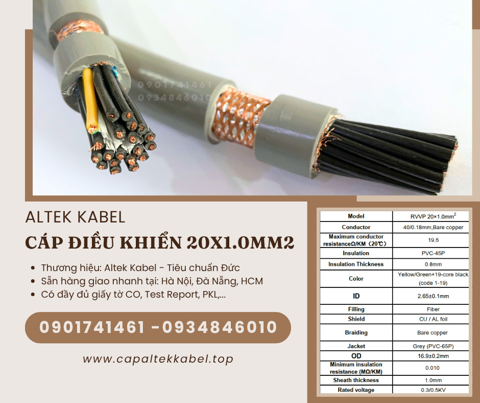Cáp điều khiển 20 lõi Altek Kabel là dòng dây tín hiệu chuyên dụng cho hệ thống tự động hóa, dây chuyền sản xuất, tủ điện điều khiển, cảm biến, camera và thiết bị PLC.