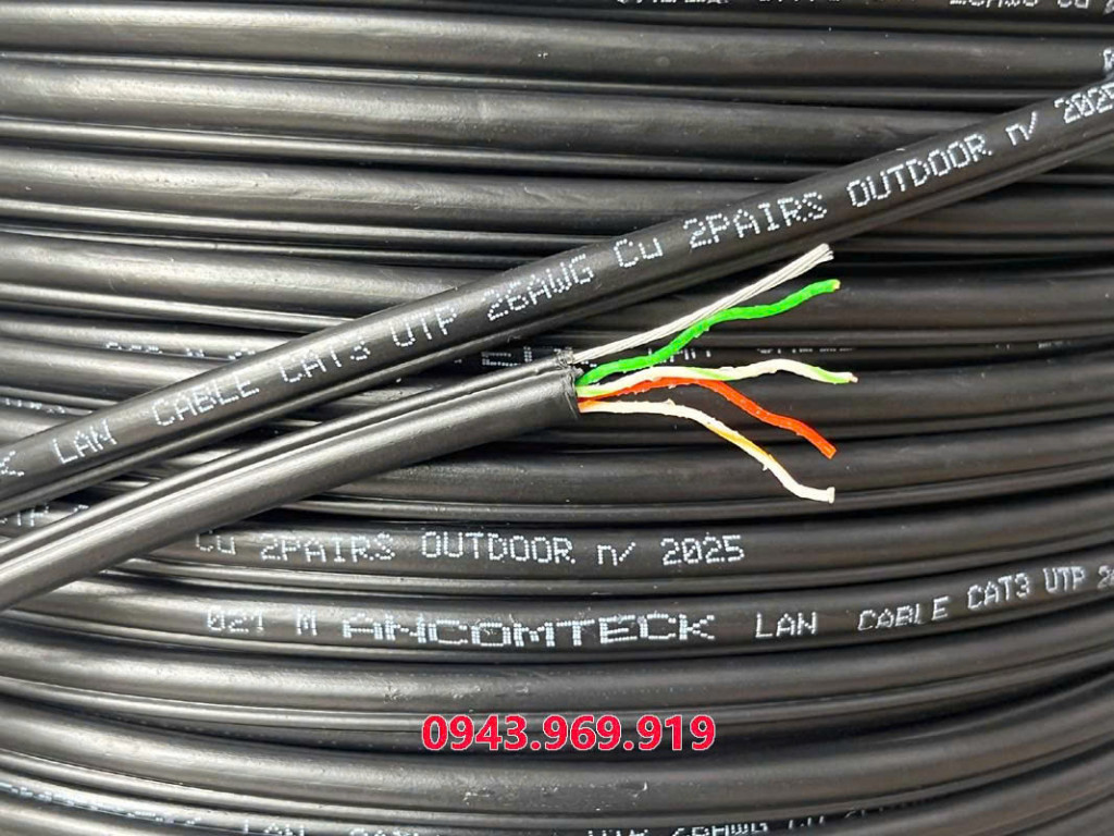 - Dây Cat3 UTP ngoài trời ANCOMTECK với 4 lõi đồng, đồng dầu và 1 dây thép cường lực sử dụng ngoài trời và chịu được điều kiện thời tiết khắc nghiệt.
