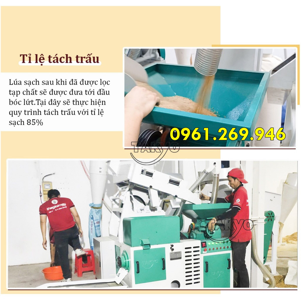 Tỉ lệ tách trấu : Lúa sạch sau khi đã được lọc tạp chất sẽ được đưa tới đầu bóc lứt. Tại đây sẽ thực hiện quy trình tách trấu với tỉ lệ sạch 85%