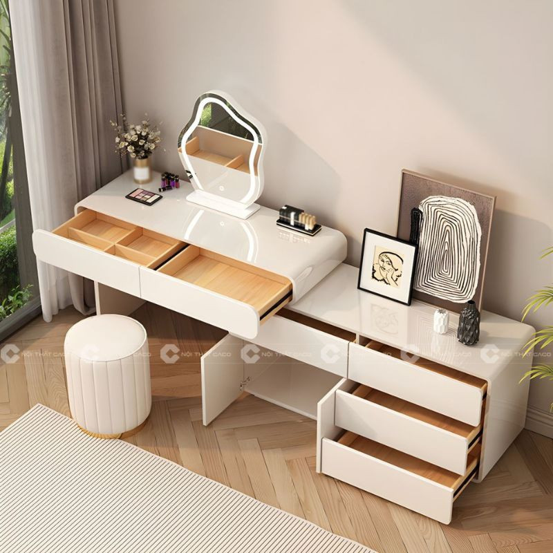 Được làm từ gỗ MDF cao cấp, bàn có bề mặt trắng sang trọng, bền đẹp và dễ phối với nhiều phong cách nội thất phòng ngủ. Thiết kế thông minh với nhiều ngăn kéo và kệ tiện lợi, giúp sắp xếp đồ trang điểm gọn gàng, tiết kiệm không gian.