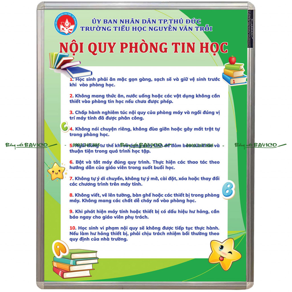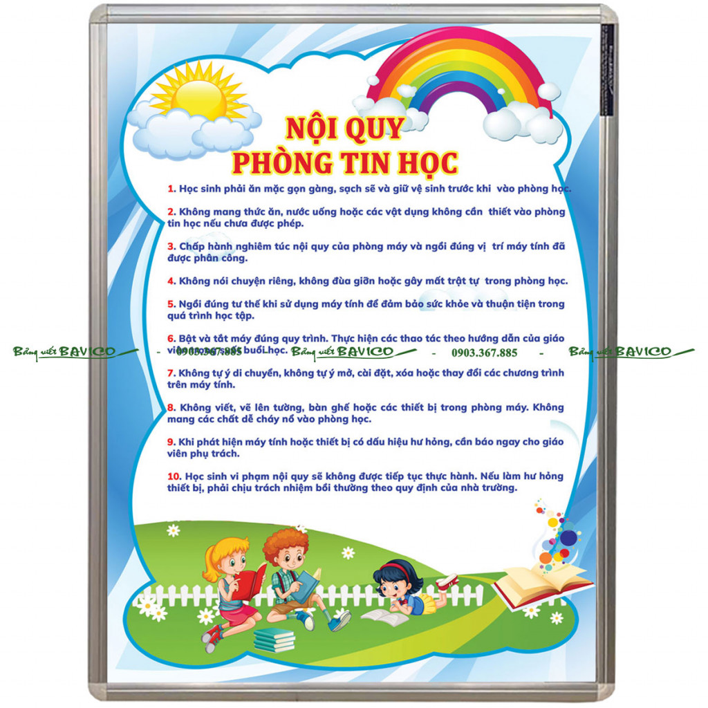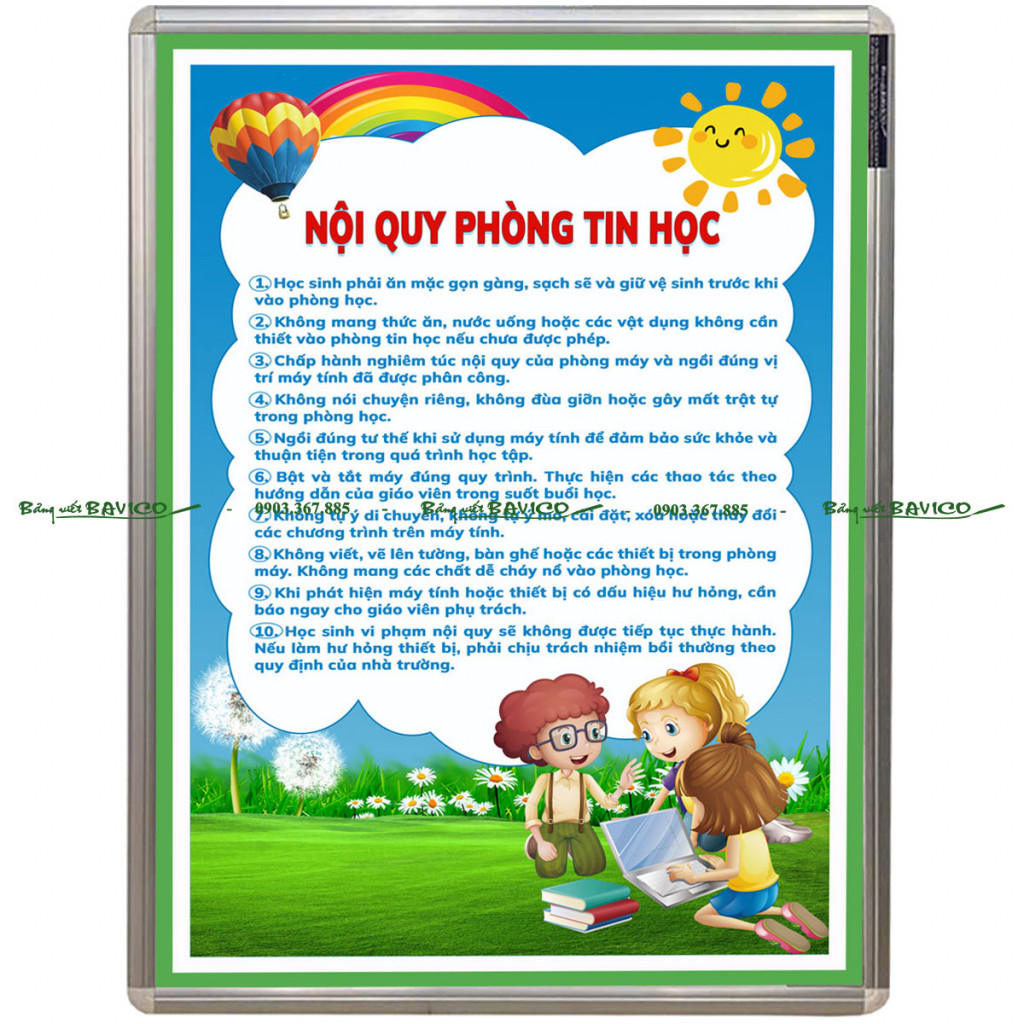 Hiện nay, BẢNG NỘI QUY PHÒNG TIN HỌC của BAVICO đang được nhiều trường học, trung tâm đào tạo và cơ sở giáo dục lựa chọn bởi thiết kế đẹp, nội dung rõ ràng và độ bền cao. Đây là giải pháp hiệu quả giúp quản lý phòng máy một cách khoa học và chuyên nghiệp.