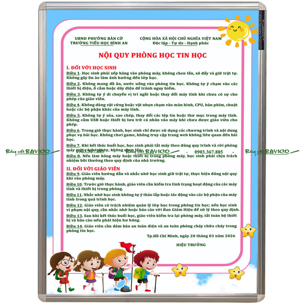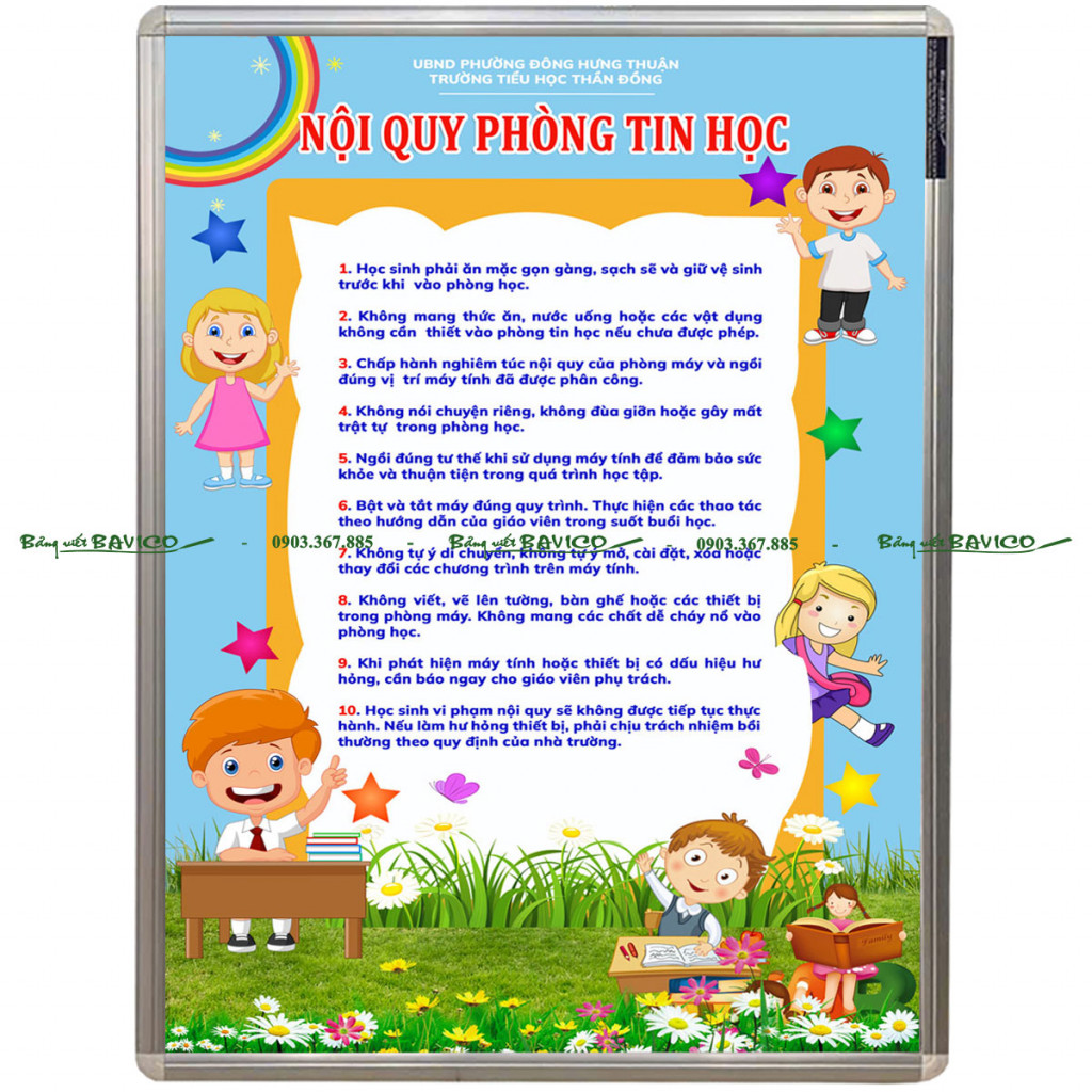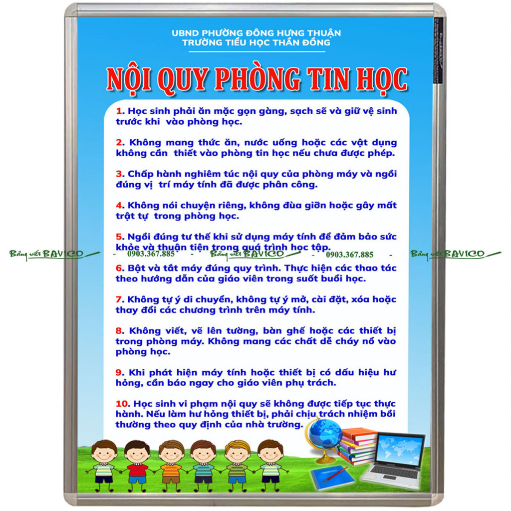 Hiện nay, BẢNG NỘI QUY PHÒNG TIN HỌC của BAVICO đang được nhiều trường học, trung tâm đào tạo và cơ sở giáo dục lựa chọn bởi thiết kế đẹp, nội dung rõ ràng và độ bền cao. Đây là giải pháp hiệu quả giúp quản lý phòng máy một cách khoa học và chuyên nghiệp.