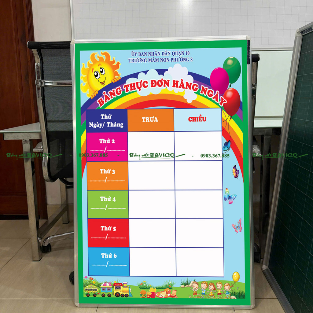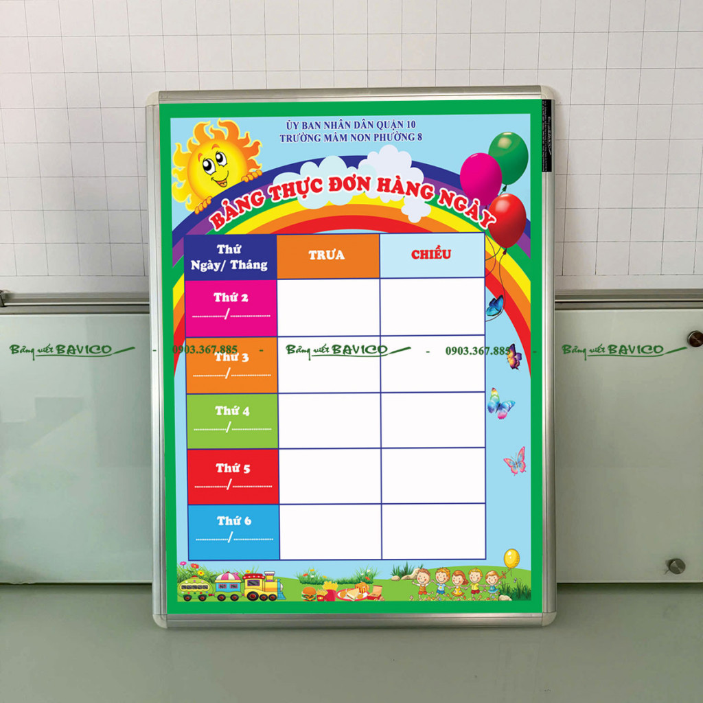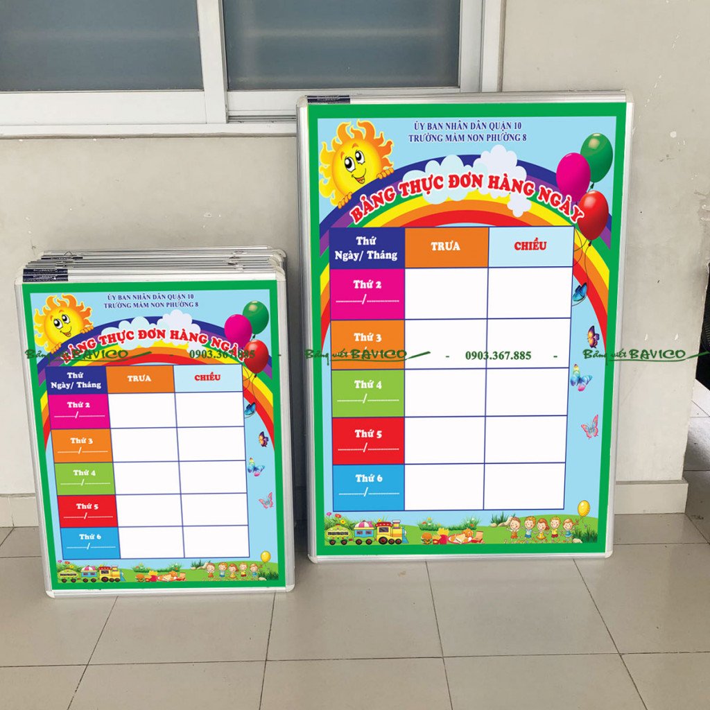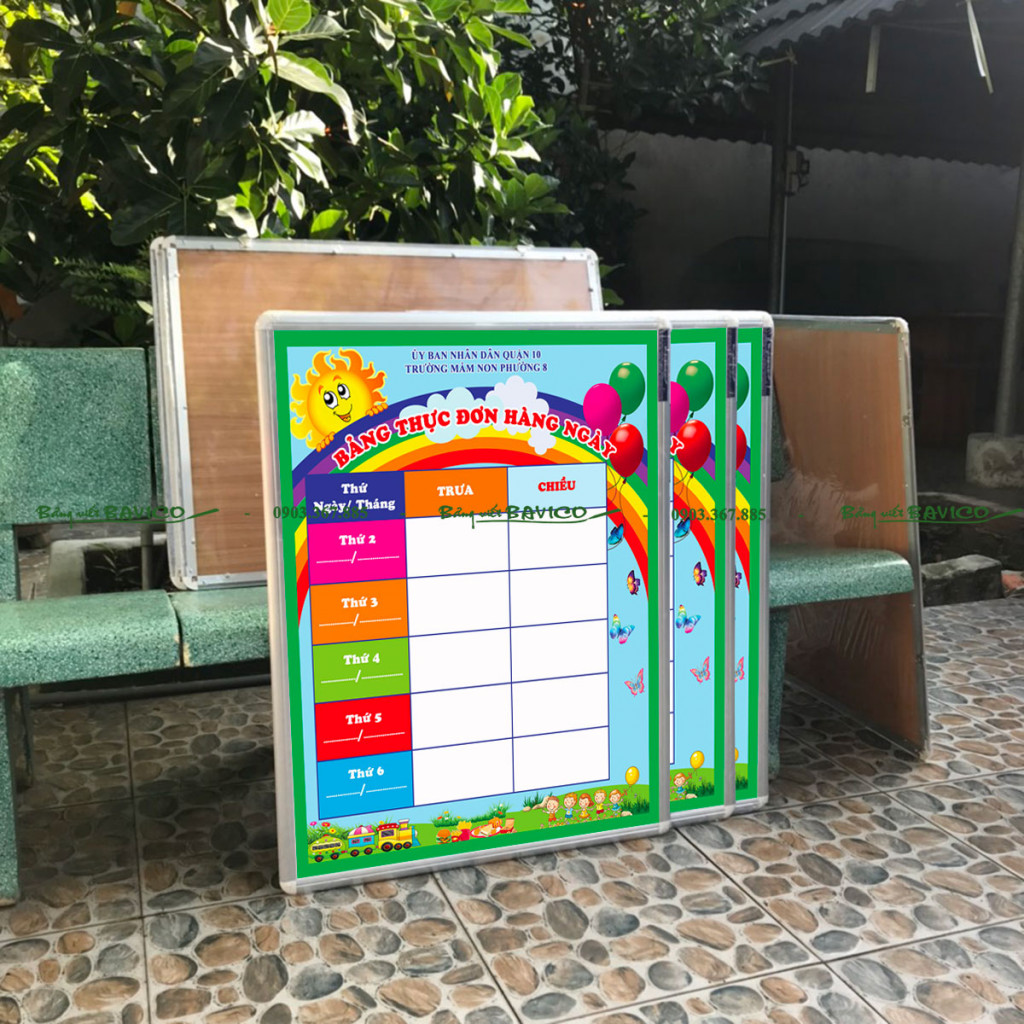 1. Mặt bảng: bằng polyester của Taiwan, dễ lau. Được dán PP có in “BẢNG THỰC ĐƠN (M02)”. Nội dung có thể thay đổi theo yêu cầu khách hàng. Mực in sắc nét, màu sắc tươi sáng phù hợp cho mọi không gian. Tấm PP sẽ dán trực tiếp nên mặt bảng mica trắng trước khi viền khung nhôm.